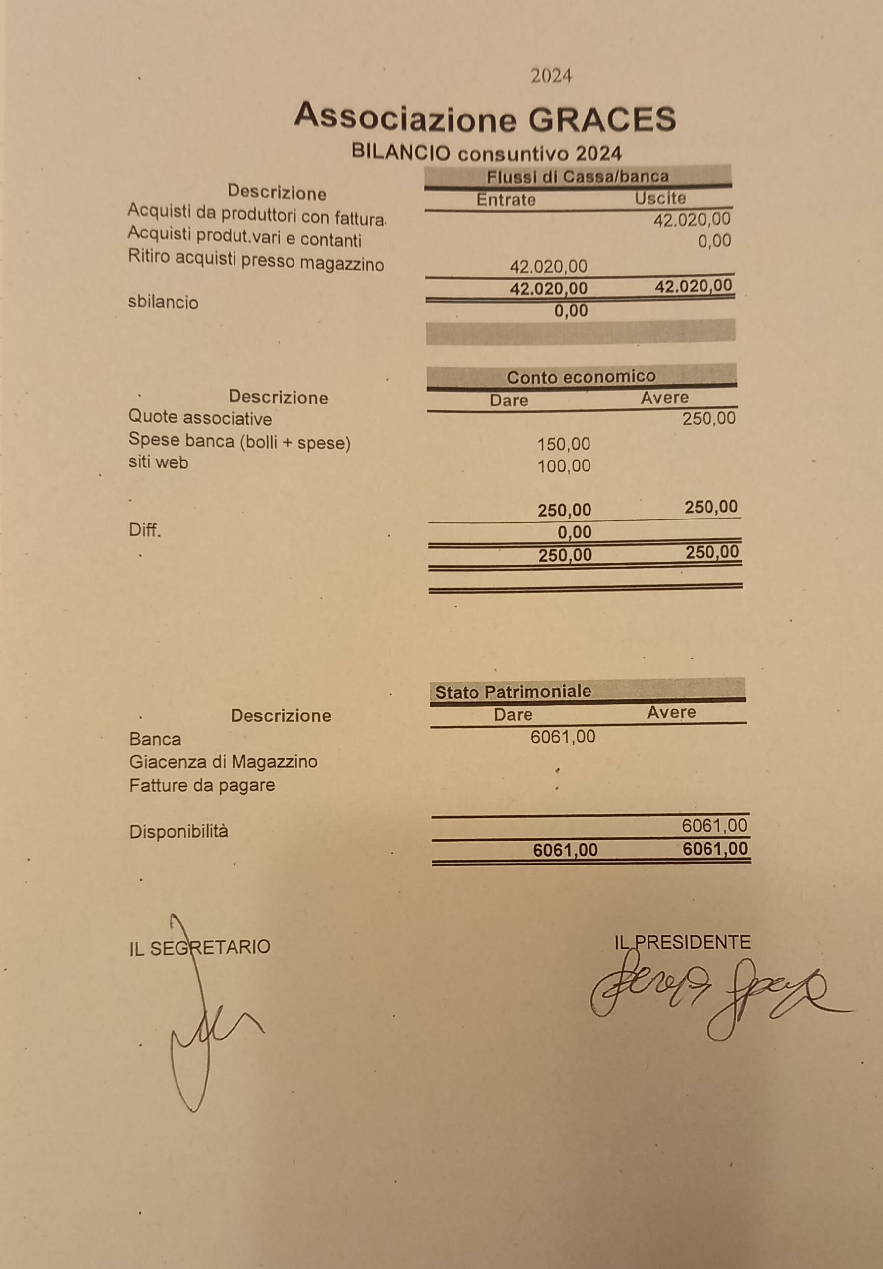 - Nicola espone il bilancio del 2024, commentando gli ordini fatti e l’andamento degli ordini con i vari fornitori. Bilancio approvato all’unanimità